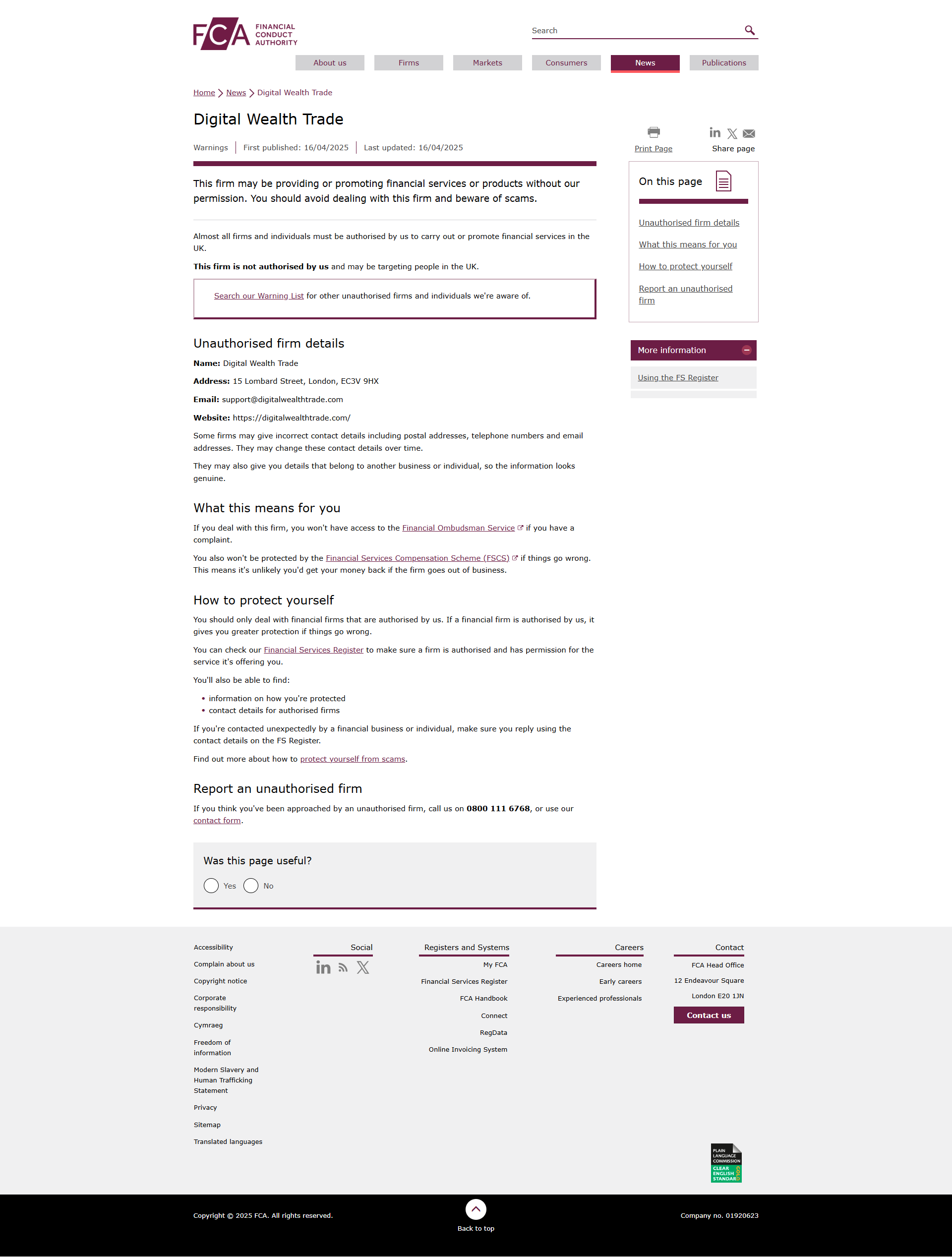 警告 首次发布日期:2025年4月16日 最后更新日期:2025年4月16日 该公司可能在未经我们许可的情况下提供或推广金融服务或产品。您应避免与该公司打交道,并谨防诈骗。几乎所有公司和个人都必须获得我们的授权才能在英国开展或推广金融服务。该公司未经我们授权,可能以英国人为目标。在我们的警告列表中搜索我们所知的其他未经授权的公司和个人。未经授权的公司详情名称: Digital Wealth Trade地址:15 lombard street, london, ec3v 9hx 邮箱:support@digitalwealthtrade.com 网址:https://digitalwealthtrade.com/ 一些公司可能会提供错误的联系方式,包括邮政地址、电话号码和电子邮件地址。他们可能会随时更改这些联系方式。他们也可能会向您提供其他企业或个人的详细信息,以使信息看起来真实。这对您意味着什么?如果您与这家公司打交道,您将无法在投诉时获得金融申诉专员服务。如果出现问题,您也不会受到金融服务补偿计划 (FSCS) 的保护。这意味着如果该公司倒闭,您不太可能拿回您的钱。如何保护自己?您应该只与我们授权的金融公司打交道。如果一家金融公司获得了我们的授权,那么在出现问题时,它将为您提供更大的保护。您可以查看我们的金融服务注册表,以确保该公司已获得授权并有权向您提供服务。您还可以找到:有关如何保护您授权公司的联系方式的信息如果您意外地被金融企业或个人联系,请确保使用金融服务登记册上的联系方式回复。了解有关如何保护自己免遭诈骗的更多信息。