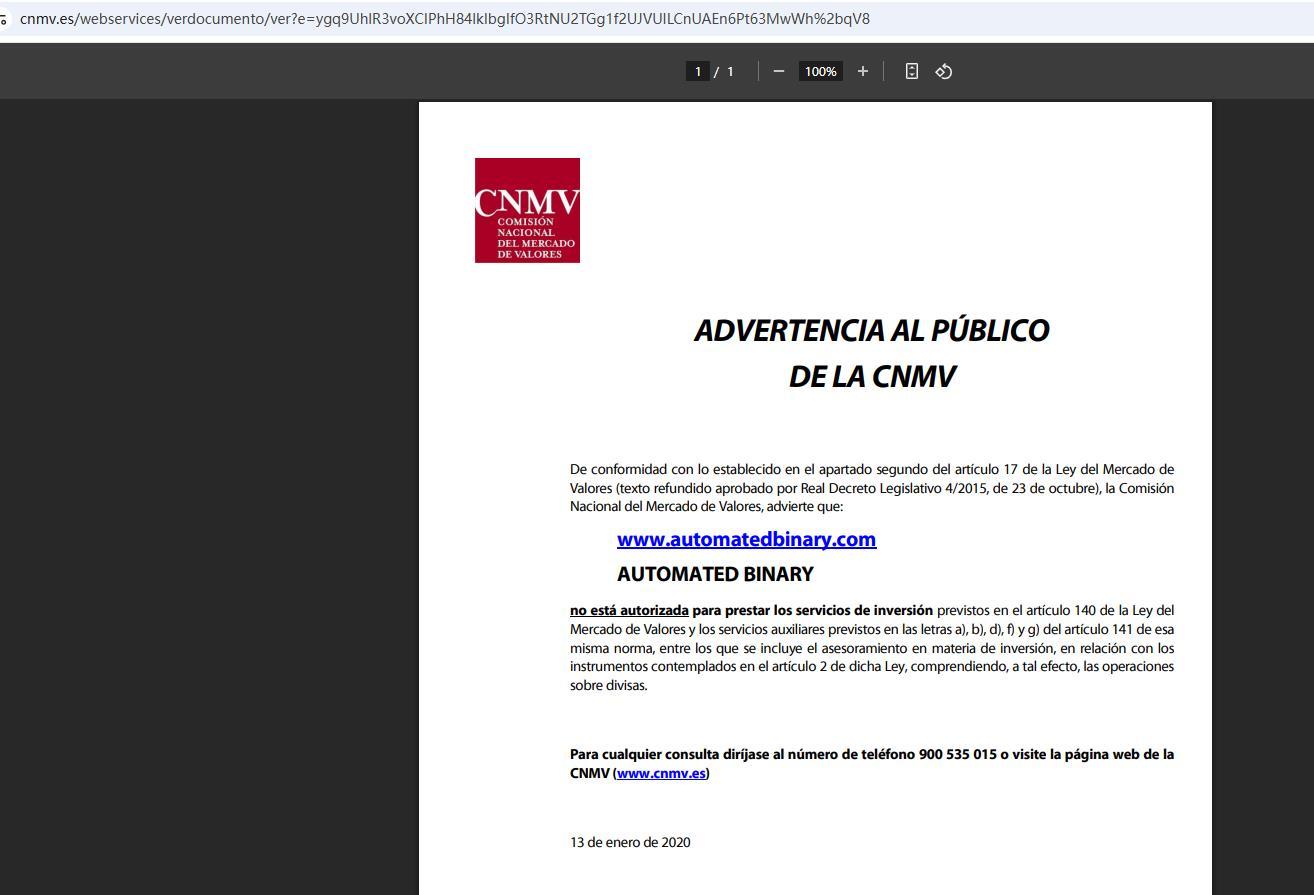 国家证券市场委员会公告,根据《证券市场法》(经2015年10月23日第4号皇家立法法令批准的合并文本)第17条第二款的规定,国家证券市场委员会警告:automatedbinary.com Automated Binary它无权提供《证券市场法》第 140 条所规定的投资服务以及该法第 141 条 a)、b)、d)、f) 和 g) 项所规定的辅助服务,其中包括与该法第 2 条所述工具相关的投资建议,包括为此目的而进行的货币交易。如有任何疑问,请致电 900 535 015 或访问 CNMV 网站 (www.cnmv.es) 2020 年 1 月 13 日