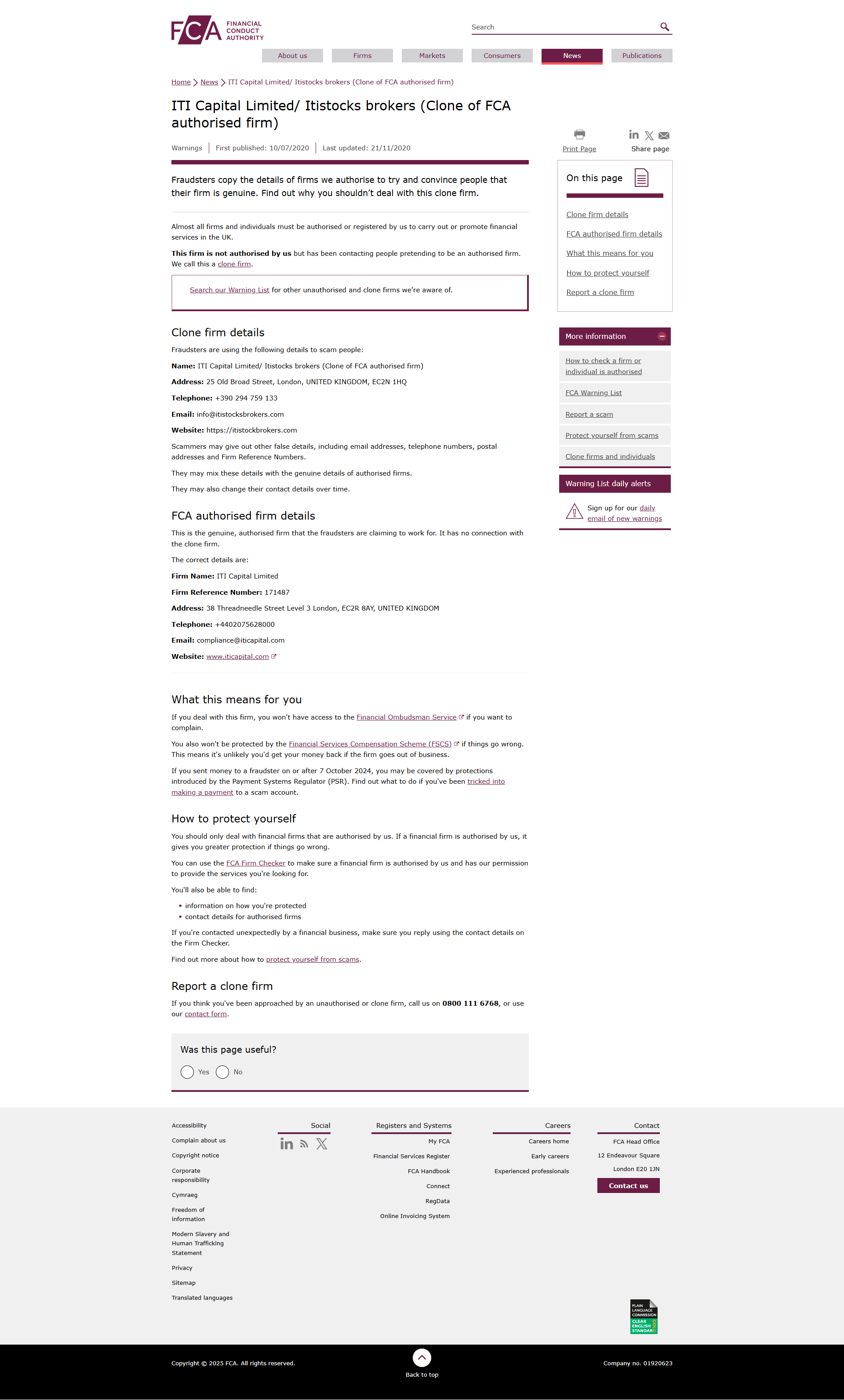 英国金融行为监管局(FCA)未授权公司警告清单 ITI Capital Limited/ Itistocks brokers(FCA授权公司的克隆公司).