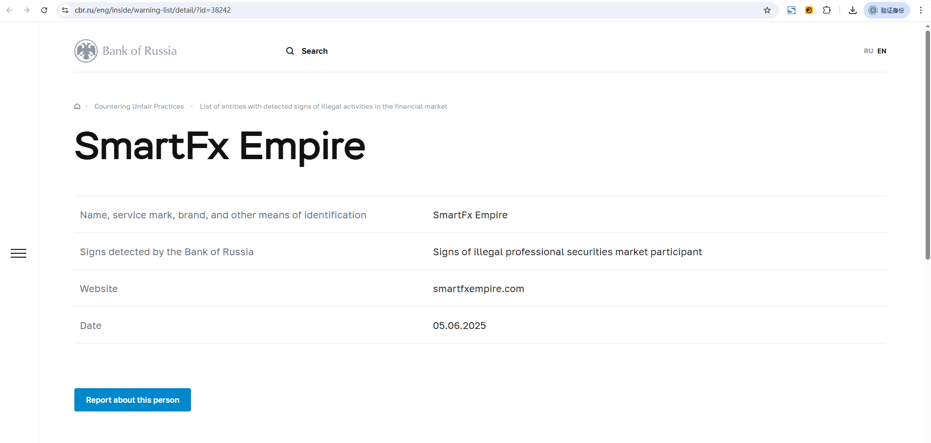 名称、服务标志、品牌及其他识别方式 SmartFx Empire 俄罗斯银行检测到的标志 非法证券职业市场参与者的标志 网站 smartfxempire.com 日期 05.06.2025.