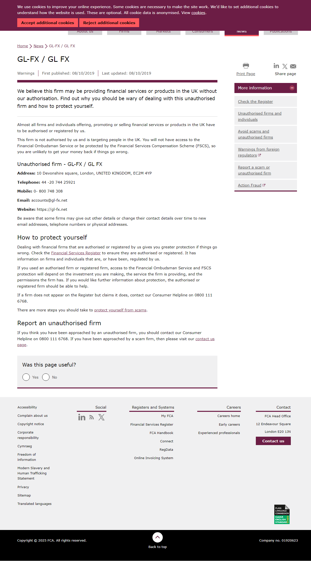 FCA未经授权公司警告清单 GL-FX / GL FX.