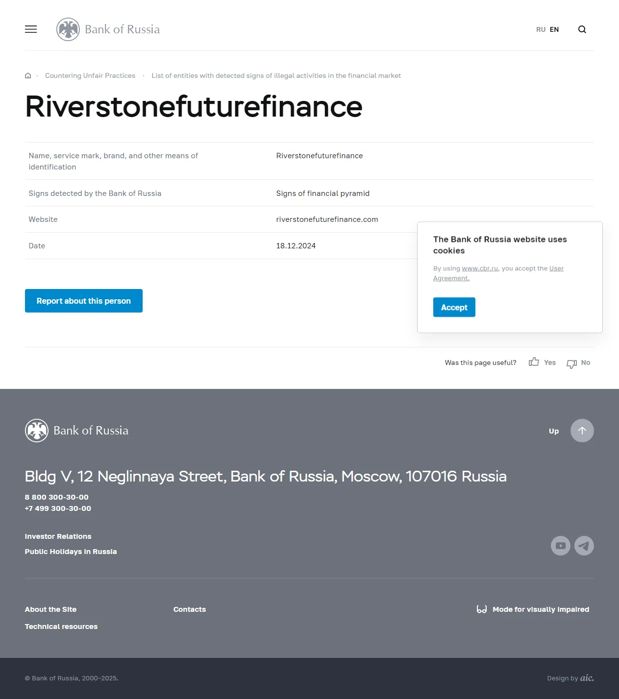 名称、服务标识、品牌及其他识别方式 Riverstonefuturefinance 俄罗斯银行检测到的迹象 金融金字塔迹象 网站 riverstonefuturefinance.com 日期 18.12.2024.