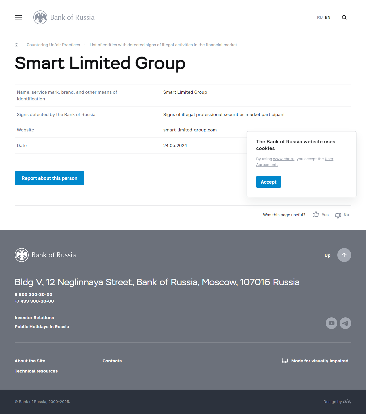 名称、服务标志、品牌及其他识别方式 Smart Limited Group 俄罗斯银行检测到的迹象 非法专业证券市场参与者的迹象 网站 smart-limited-group.com 日期 24.05.2024.
