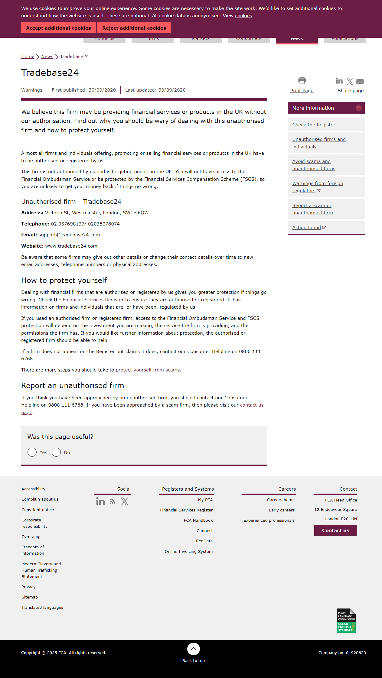 ['我们相信这家公司可能未经我们授权就在英国提供金融服务或产品。了解为何您应对与这家未经授权的公司打交道保持警惕,以及如何保护自己。在英国提供、推广或销售金融服务或产品的几乎所有公司和个人都必须获得我们的授权或注册。这家公司未经我们授权,并且针对英国民众。您将无法使用金融申诉专员服务,也不受金融服务补偿计划(FSCS)的保护,因此如果出现问题,您不太可能拿回您的资金。未经授权的公司 - Tradebase24 地址:Victoria St, Westminster, London, SW1E 6QW 电话:02 037698137/ 02038078074 电子邮件:support@tradebase24.com 网站:www.tradebase24.com 请注意,一些公司可能会提供其他详细信息,或随着时间的推移更改其联系信息,如新的电子邮件地址、电话号码或实际地址。如何保护自己 与经我们授权或注册的金融公司打交道可以在出现问题时为您提供更大的保护。请查阅金融服务注册表以确保它们已获得授权或注册。该注册表包含受我们监管或曾经受我们监管的公司和个人的信息。如果您使用的是授权公司或注册公司,能否使用金融申诉专员服务和FSCS保护将取决于您所做的投资、公司提供的服务以及公司拥有的权限。如果您想了解更多关于保护的信息,授权或注册公司应能提供帮助。如果某公司未出现在注册表中但声称已注册,请拨打我们的消费者帮助热线0800 111 6768与我们联系。还有更多步骤可以帮助您保护自己免受诈骗。如果您认为自己被未经授权的公司联系过,应拨打我们的消费者帮助热线0800 111 6768。如果您被诈骗公司联系过,请访问我们的联系我们页面。'].