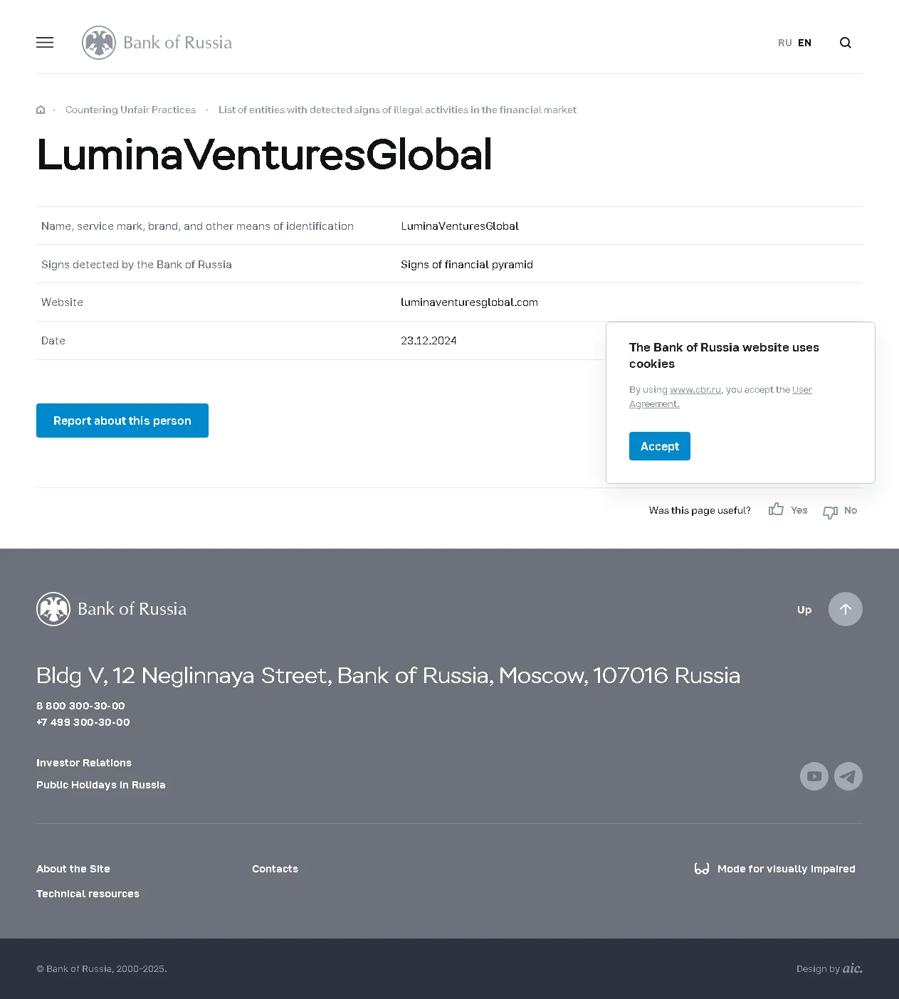 名称、服务标志、品牌及其他识别方式 LuminaVenturesGlobal 俄罗斯银行检测到的迹象 金融金字塔迹象 网站 luminaventuresglobal.com 日期 23.12.2024.