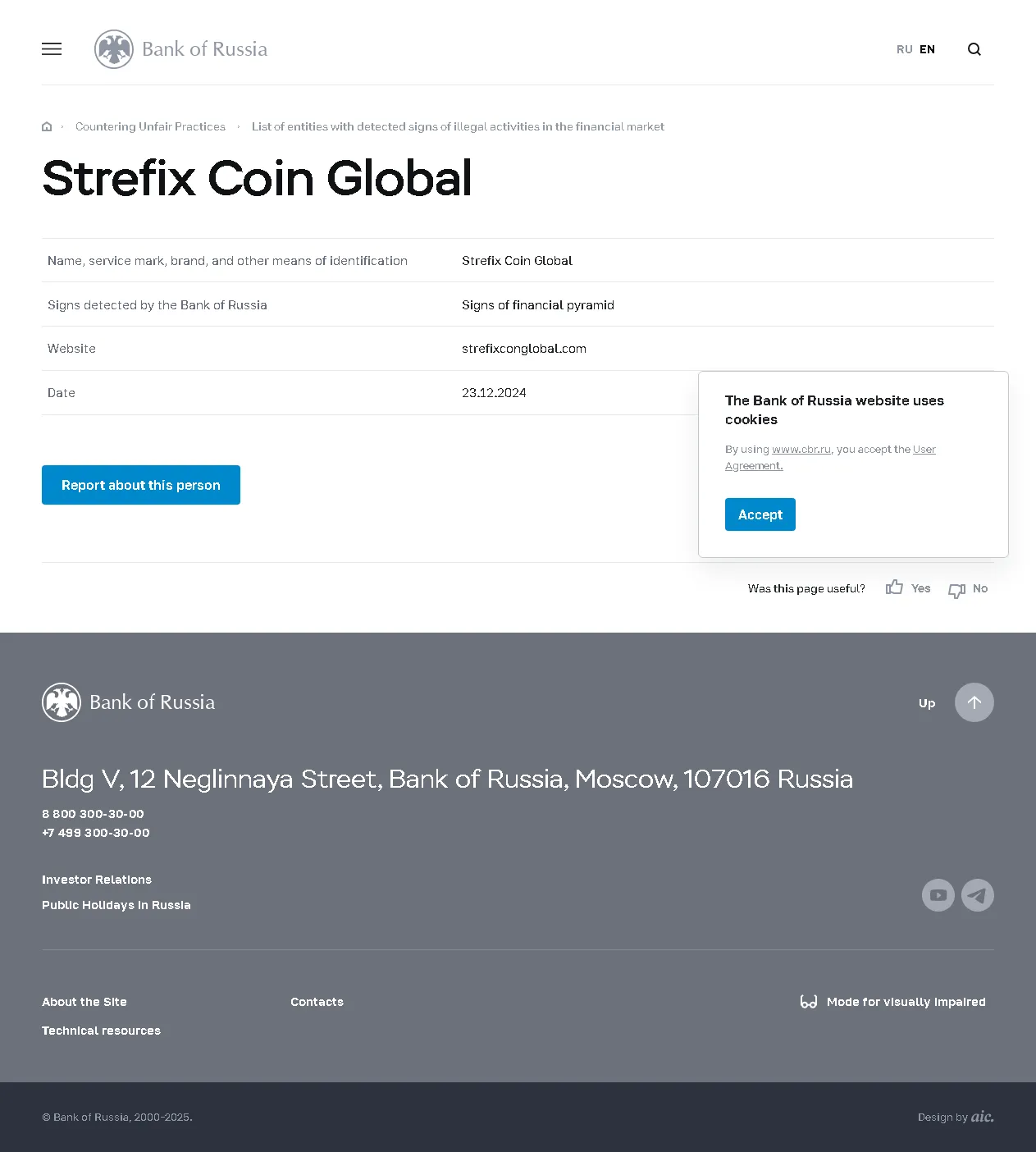 名称、服务标志、品牌及其他识别方式 Strefix Coin Global 俄罗斯银行检测到的迹象 金融金字塔的迹象 网站 strefixconglobal.com 日期 2024年12月23日.