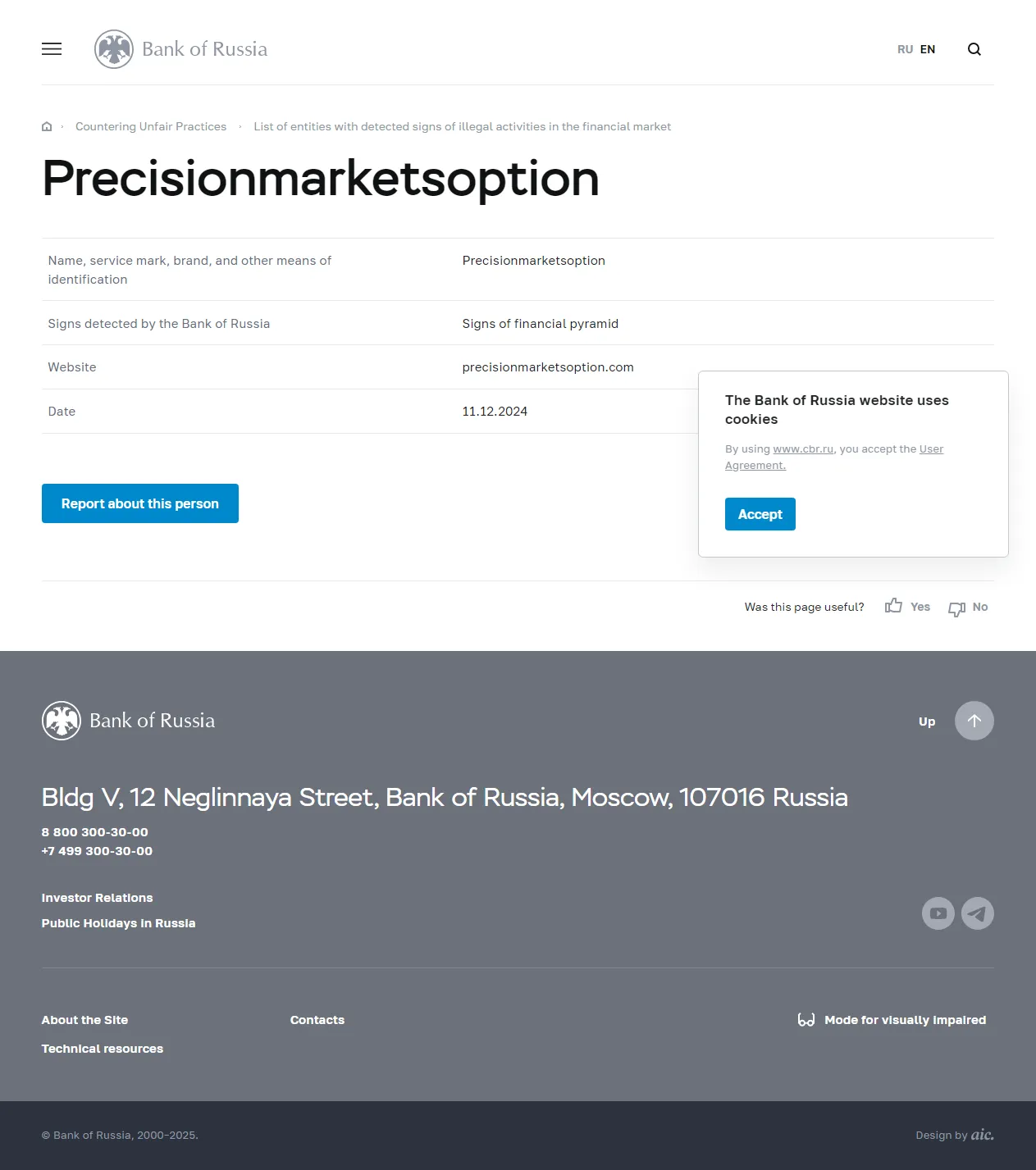 名称、服务标志、品牌及其他识别方式 Precisionmarketsoption 俄罗斯银行检测到的迹象 金融金字塔迹象 网站 precisionmarketsoption.com 日期 2024年12月11日.