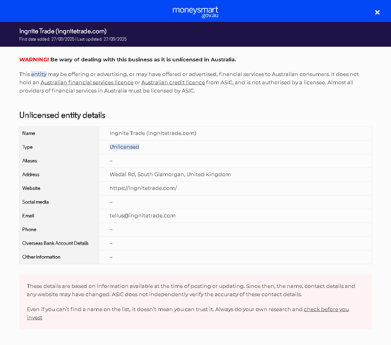 名称Ingnite Trade (ingnitetrade.com) 类型无牌照向澳大利亚民众提供金融服务(包括金融产品)。他们未持有澳大利亚证券和投资委员会(ASIC)颁发的澳大利亚金融服务(AFS)牌照或澳大利亚信贷执照。 别名– 地址英国南格拉摩根Wedal路 网站https://ingnitetrade.com/ 社交媒体– 电子邮箱tellus@ingnitetrade.com 电话– 海外银行账户信息– 其他信息–.