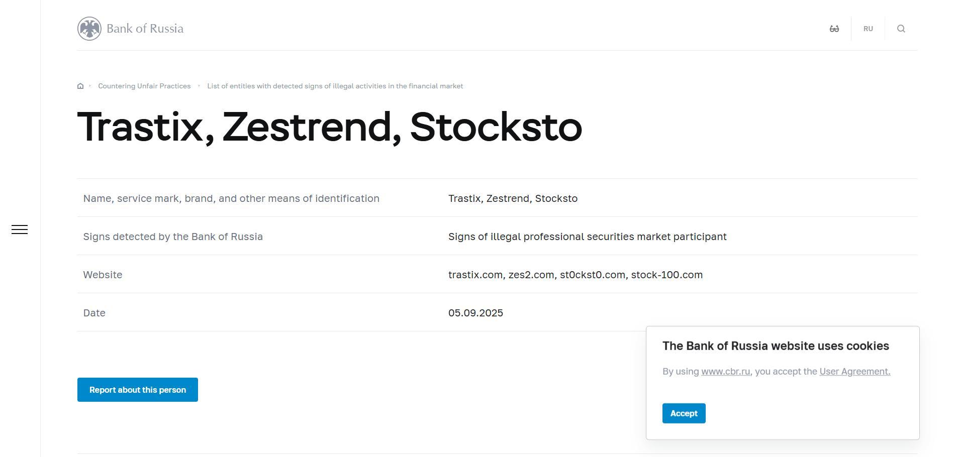 名称、服务标志、品牌及其他识别方式 Trastix、Zestrend、Stocksto 俄罗斯银行检测到的迹象 非法证券市场主体专业迹象 网站 trastix.com、zes2.com、st0ckst0.com 日期 05.09.2025.