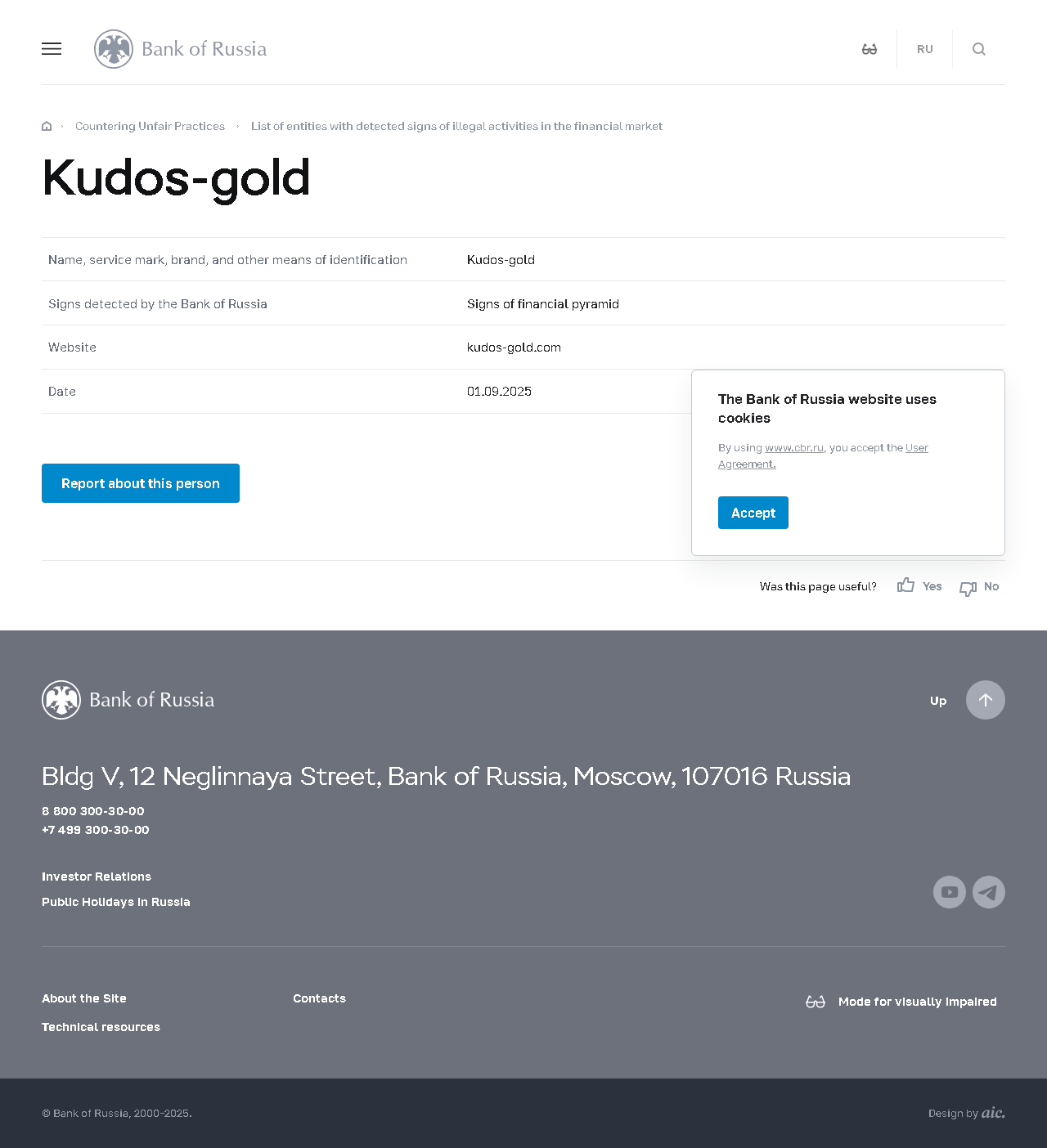 名称、服务标志、品牌及其他识别方式 Kudos-gold 俄罗斯银行检测到的迹象 金融金字塔迹象 网站 kudos-gold.com 日期 01.09.2025.
