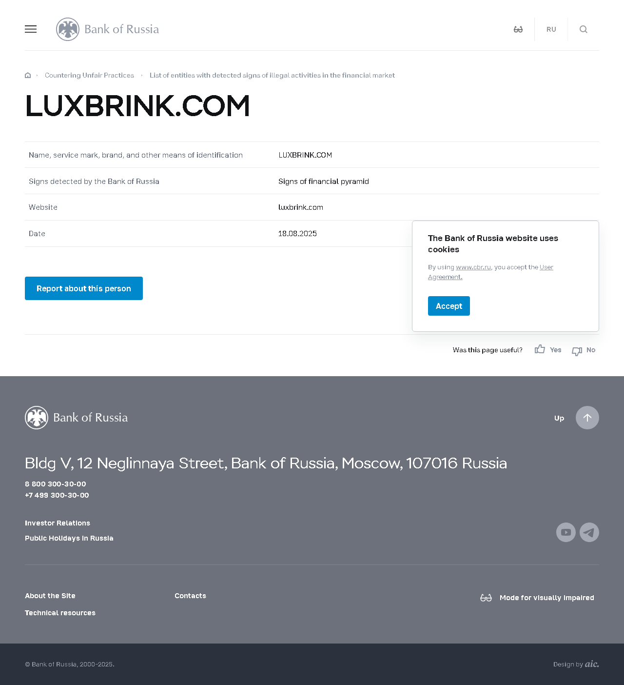 名称、服务标志、品牌及其他识别方式 LUXBRINK.COM 俄罗斯银行检测到的迹象 金融金字塔特征 网站 luxbrink.com 日期 18.08.2025.