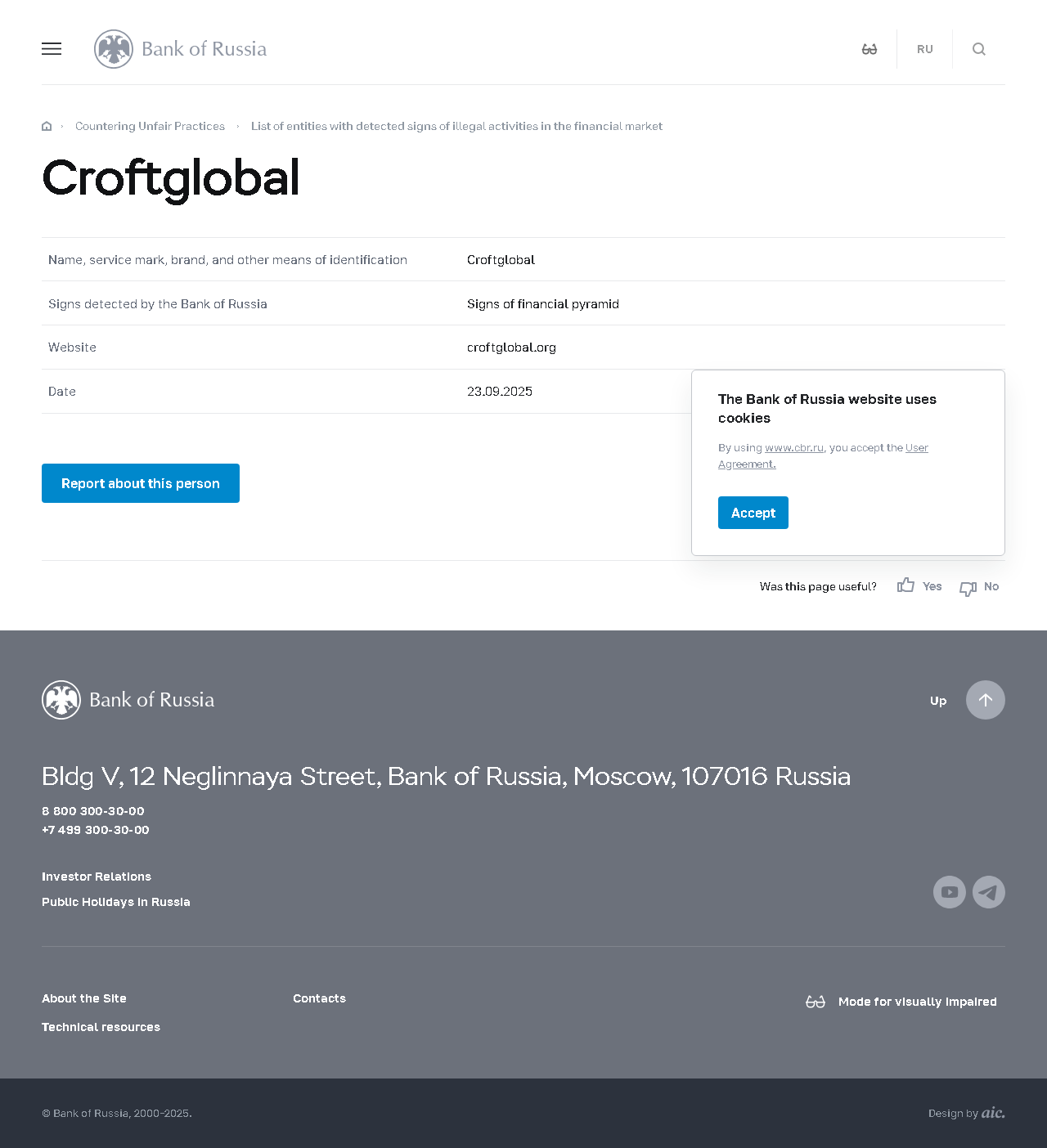 名称、服务标志、品牌及其他识别方式 Croft全球 俄罗斯央行检测到的迹象 金融金字塔迹象 网站 croftglobal.org 日期 23.09.2025.