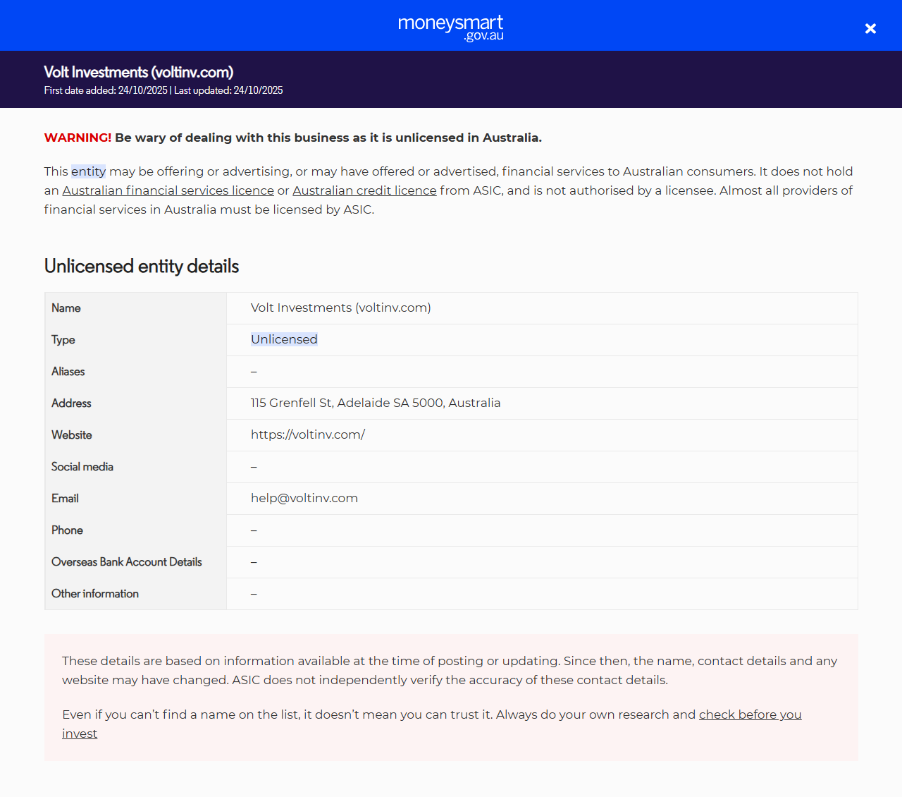 名称Volt投资公司(voltinv.com) 类型无牌照向澳大利亚民众提供金融服务(包括金融产品)。他们未持有澳大利亚证券和投资委员会(ASIC)颁发的澳大利亚金融服务(AFS)牌照或澳大利亚信贷牌照。 别名– 地址澳大利亚南澳大利亚州阿德莱德市格伦费尔街115号,邮编5000 网站https://voltinv.com/ 社交媒体– 电子邮箱help@voltinv.com 电话– 海外银行账户信息– 其他信息–.