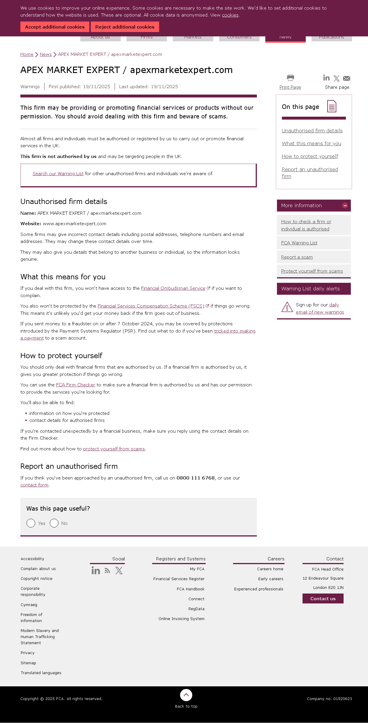FCA未经授权公司警告名单 APEX MARKET EXPERT / apexmarketexpert.com.