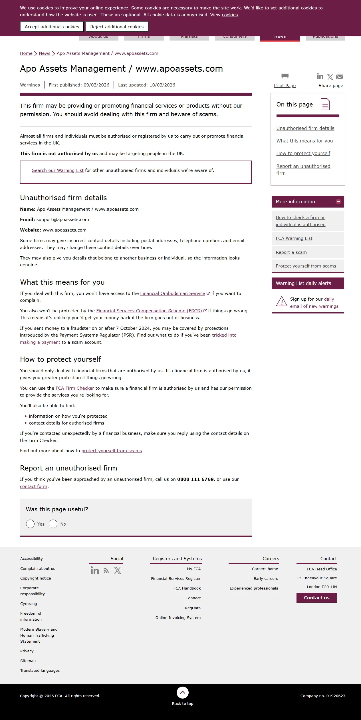 FCA 未经授权公司警告名单 Apo Assets Management / www.apoassets.com.