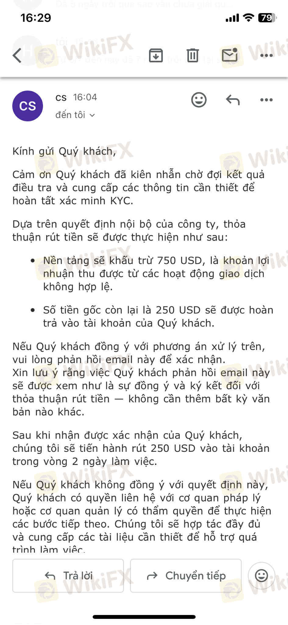 tôi không thể rút được tiền lợi nhuận và cả vốn!tôi có mở tài khoản bên macro và giao dịch có lợi nhuận và tôi có rút 1000usd nhưng không được chấp thuận và họ nói đủ lý do và trừ 750usd của tôi chỉ trả lại 250usd vốn ban đầu và đến nay tôi vẫn chưa nhận được 1usd nào từ macro,tôi có gửi nhiều mail nhưng không ai trả lời và live chat thì cũng không ai trả lời!hãy trả lại tiền cho tôi