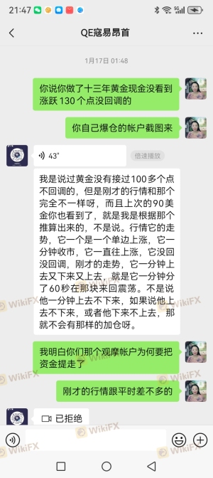 这个寇总去年我们跟他开户注册过昂首,这次我的身份证又要在他的新链接注册开户,当时就觉得很奇怪,没想到其中有诈。他说他的EA跑了三个多月都很稳,我12月30号跟他沟通时他还说上周行情猛跃200多个点,他们的EA却大赚,然后说他们的EA策略是行情大涨跃130个点以上没回调才会爆仓,他说他做了十三年黄金现货交易没见过130个点不回调,然后说我们的账户托管他们用EA跑,仓位二十万美分开仓0.02手是轻仓的,也是很稳的,他也有强调风险,就是极端行情大涨大跃超130个点的那种。但上周五16号晚上11:30左右的行情才下调68点左右,而且是很多根一根一根来下的,他也说一根K来回60秒震荡,又说很快他说技术来不及停止,这话说得很茅盾,真正快是一秒钟一根K线就播下来了,然后他技术给我帐户及我朋友张小姐帐户乱加仓,导致爆仓,你们看交易记录相隔0.3个点加了两次重仓,而且也说技术看到极端行情会停EA却没有停!而且之前有一个观摩账户给我们看,说我们的账号做单策略跟他的观摩账户一模一样,有不一样可以找他,但上周四他把观摩资金撤走,晚上我还催他给我观摩帐户看,他说他弄,但一直没提供来,然后在周五晚上他技术故意重仓把我和我朋友重仓打爆,共亏了二十多万,寇总违背了约定,请昂首平台处罚他,让他及技术给我们赔本金。