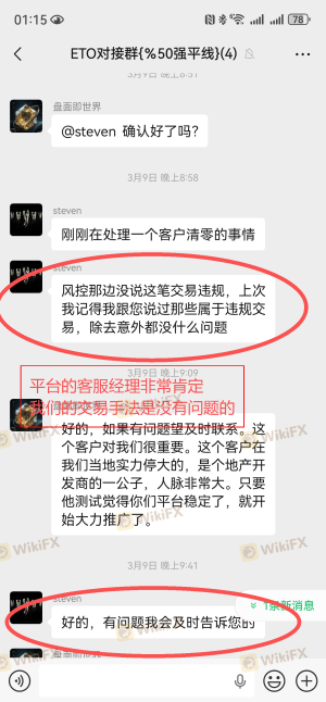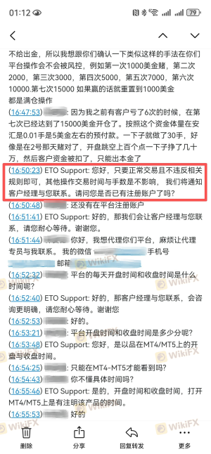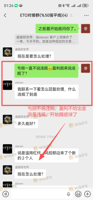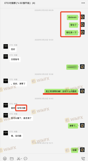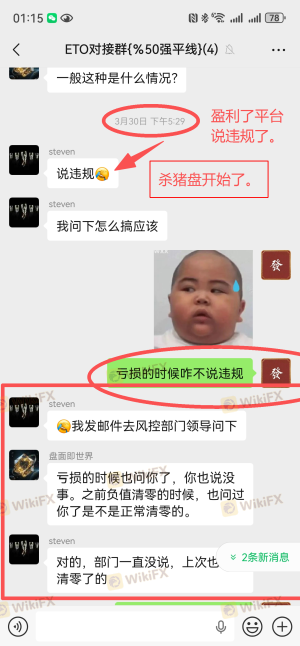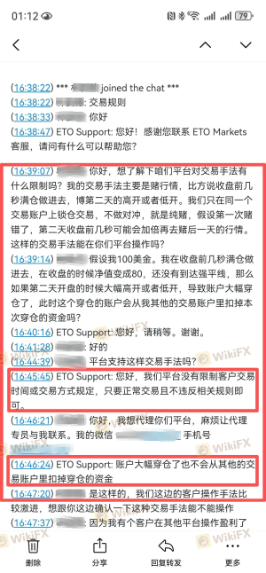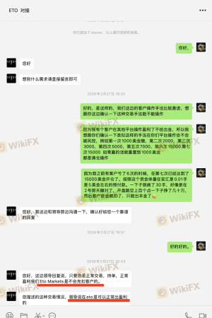 本人是ETO Markets代理,名下5个客户账户合计净值约$6003.01,平台以“交易违规”为由拒绝出金,仅允许提取本金。平台对“违规”的认定标准完全取决于交易结果是亏损还是盈利,而非交易行为本身。这是典型的选择性执行规则,严重违背公平交易原则。 一、开户前双重确认交易手法合规 2026年2月27日开户前,本人通过ETO官网在线客服咨询交易手法(收盘前几秒满仓,次日开盘出场)。客服明确回复:“平台没有限制客户交易的时间或交易方式规定”,并主动通知客户经理联系我。 随后客户经理与我沟通,表示向领导反馈。约一小时后回复:“领导说,只要您是正常交易、持单、正常盈利,Eto Markets是不会克扣客户的。您描述的交易情况,在Eto是可以正常出盈利的。” 二、亏损时平台从未认定违规 3月9日客户亏损,我向客户经理确认手法是否有问题,回复“风控那边没说这笔交易违规”。3月20日客户穿仓,申请负值清零,客户经理明确答复“正常清零”。 3月23日客户穿仓我们代客户申请清零后,在次向平台客服经理确认该手法是属于正常的,清零也是正常的 三、盈利后平台突然翻脸 3月28日,5个账户以完全相同手法交易并盈利。申请出金时,平台首次认定为“违规”,仅让出本金。平台邮件称违反客户协议第9.7条“滥用流动性测试”,但未提供任何具体订单编号、时间或证据,仅扣我返佣42.15美元。 四、核心质疑 手法相同:亏损时合规,盈利时违规。平台认定标准取决于盈亏结果,而非交易行为本身。这违背了开户前在线客服及客户经理的双重承诺。 五、诉求 兑现5个客户全部盈利(约$6003.01); 撤销对我返佣的扣款。 证据:本人保留在线客服聊天记录、客户经理多次沟通记录(含领导回复)、平台邮件截图、交易记录,可随时提供。 ETO Markets存在多起盈利后无法出金的投诉,非个案。感谢天眼工作人员协助! 注:以上截图仅为部分证据,如需更多我可随时提供。