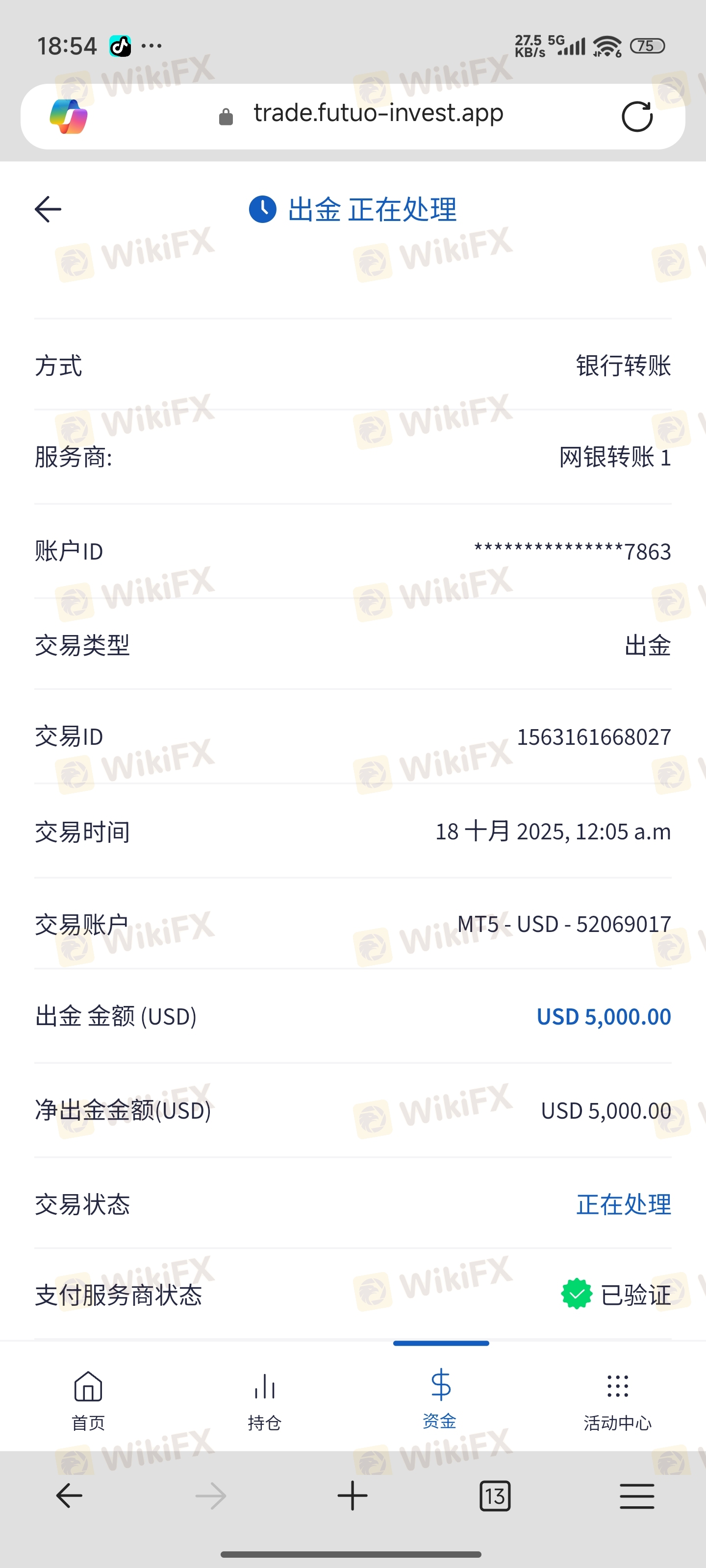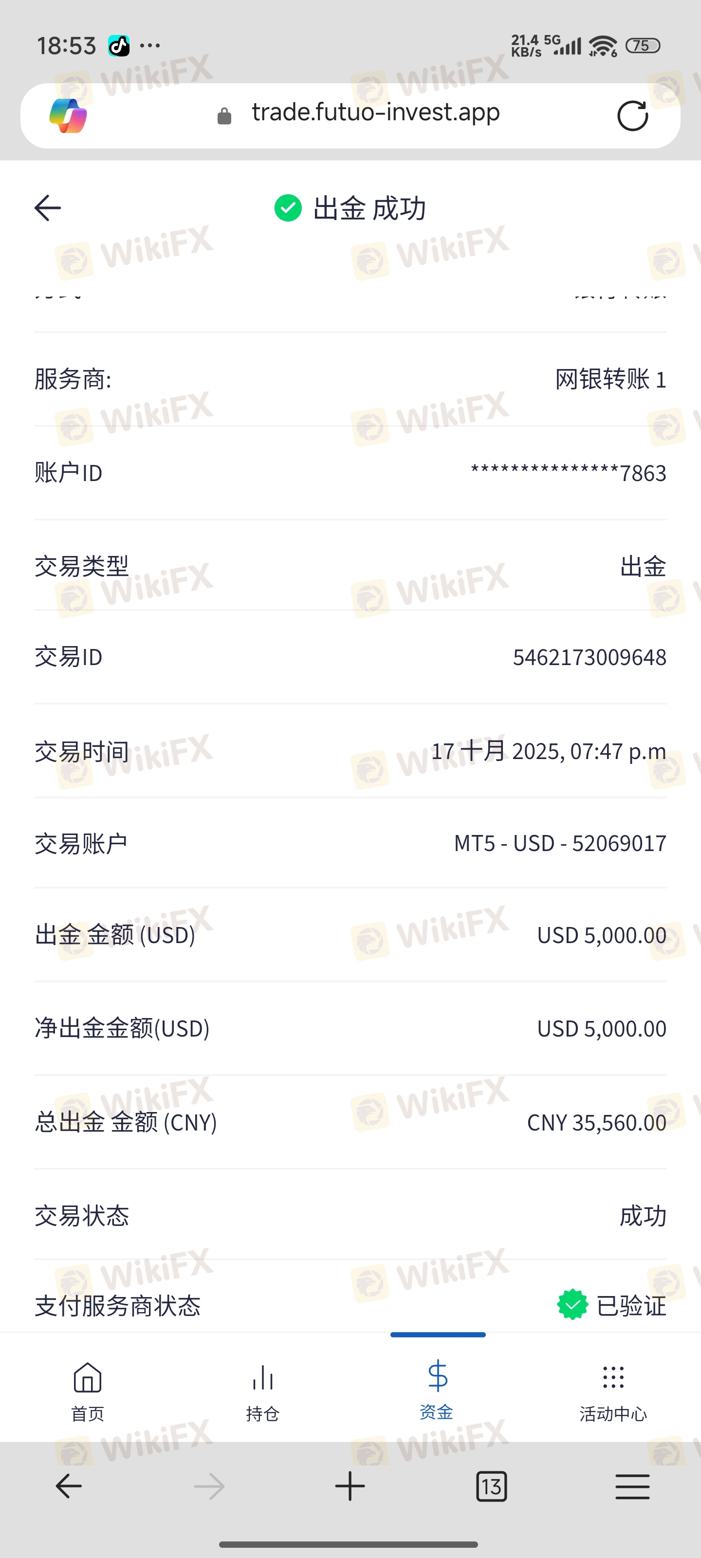 2023.3.5号下午我突然收到5条出金成功的短信提醒,我还以为开玩笑,笑着上了个厕所,想着不对头,赶紧登录账户,所有账户的资金突然被人集中转移到富拓USD钱包,正在疯狂出金,我然后赶紧修改密码,修改的过程中还在不断地出金,由于当时没留客户经理的电话,富拓以前的人工客户网页都变成了机器人,把我急死了,只能通过邮件给官方发邮件停止我的出金.我的总账户余额53000USD左右,第一个账户1700USD被转出来1500,第二个账户52000USD左右被转出来46000USD,持有仓位保证金不足平仓,从钱包的虚拟货币通道取走了15000USD,剩余了三万多,出金十几分钟完成很快,我的钱包地址是绑定验证过的,出金的15000USD并没有到我的钱包,我赶紧把剩余的金额通过绑定的银行卡取出来了。富拓太不安全了,平台竟然出金不做本人验证,无法保证资金安全,客服最终的回复说我的邮件信息泄露,确保第三方不能访问我的电子邮件,关键问题是富拓没有做出金验证,也不会发验证码给邮箱,访问我的邮箱有什么用。这导致我的债务危机,总损失超过20000USD