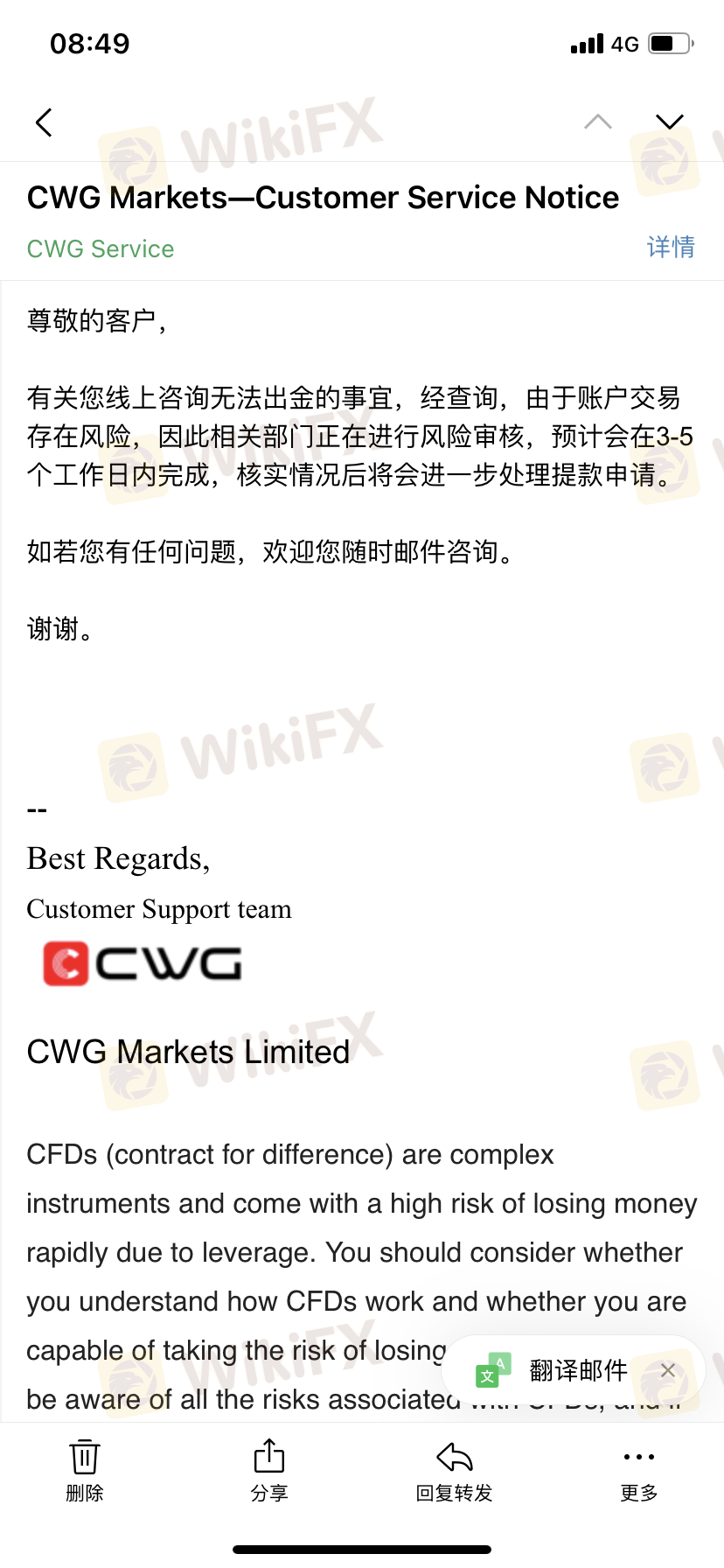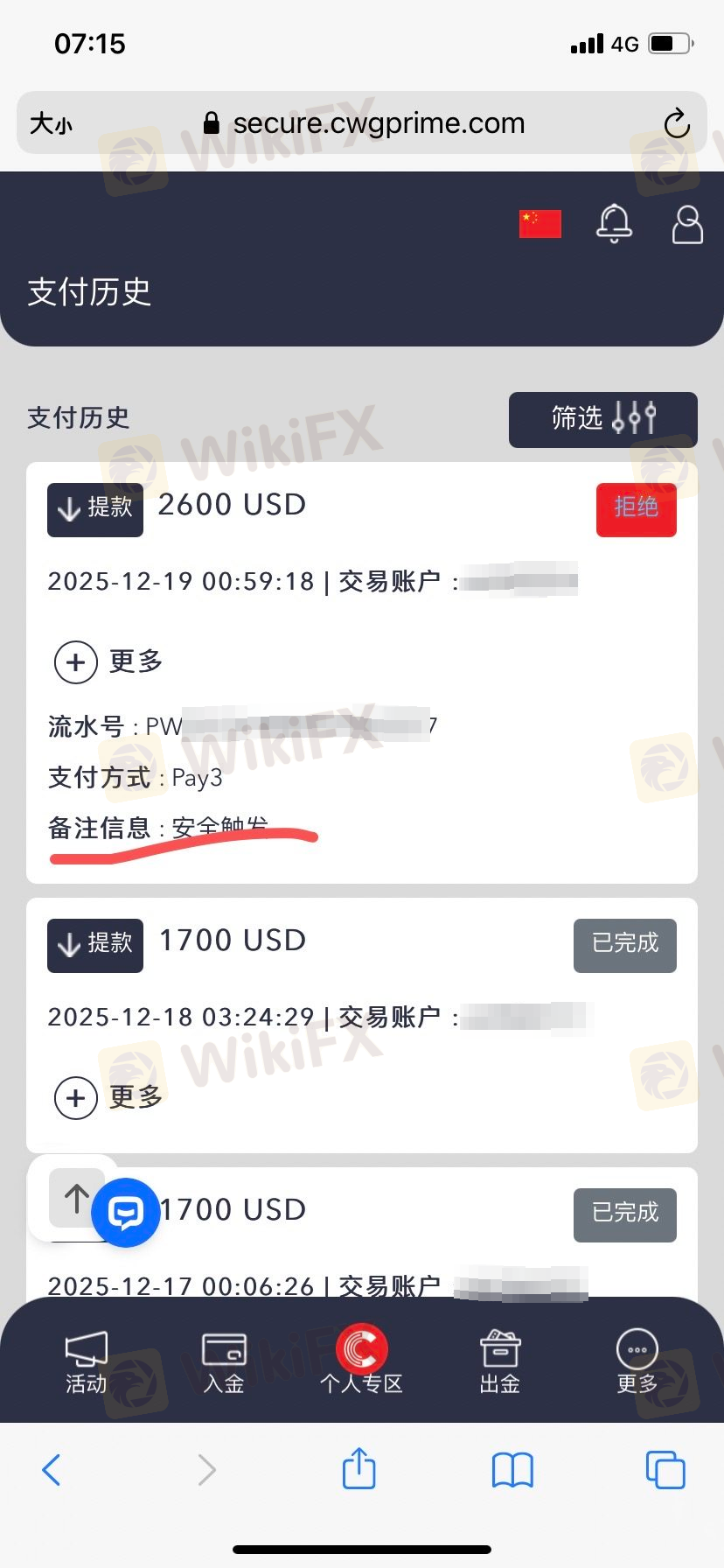 我在6/21入金10万美金后开始交易,有获利时出金也都没问题,直到7/31要再申请出金时就不给出金了,打电话给相关人员就不断的推托,直到9/23日CWG的交易部门写信来才说我『违规交易』,没有任何的举证,然后把我在MT4里面的34579.43金额给无理由移走。 我自己交易外汇保证金那么久了,第一次遇到这种可以给一个『违规交易』就可以把你的金额转走的平台,因为英国需要我提抗议信件需要8周才能投诉,所以我要在这里提醒CWG的客户,这个平台要特别的小心了~要千万千万的小心~ ps:我提供的照片都是我自己的后台截图,我把我的姓名与资料打马赛克是怕被平台报复,把我其他资料全部删除~