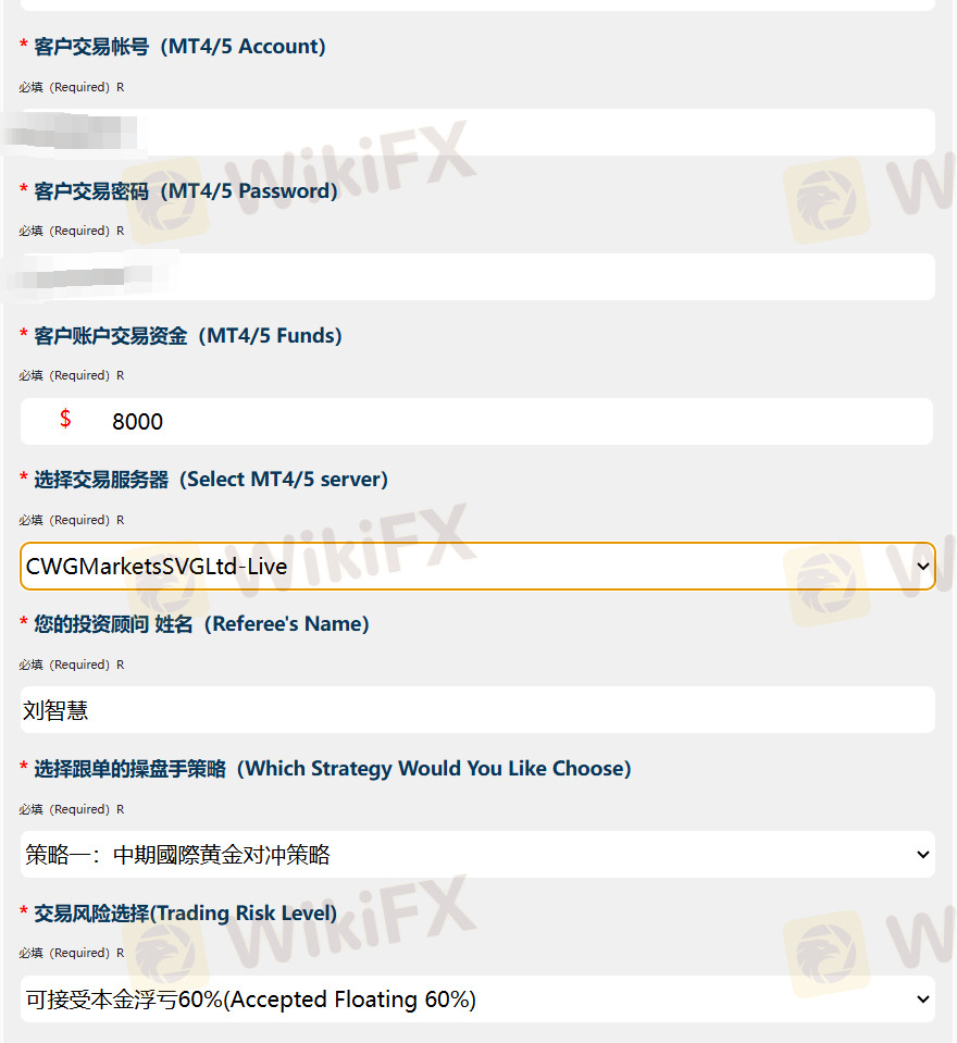 CWG Markets有四种账户类型:即时账户、标准账户、高级账户和机构账户。希望低点差和杠杆的交易者可以选择机构账户,而预算较小的交易者可以开设即时账户。此外,模拟账户主要用于熟悉交易平台和教育目的。还提供复制交易功能,这是一种让没有时间进行广泛研究或希望实现投资组合多样化的经验不足的交易者或跟随者复制经验丰富的交易者(也称为资金经理或复制交易专家)交易的方式。穆斯林可以开设无利息的伊斯兰账户账户。
