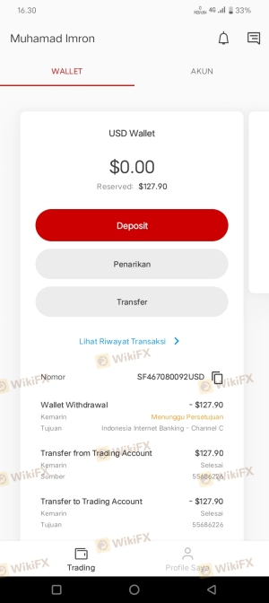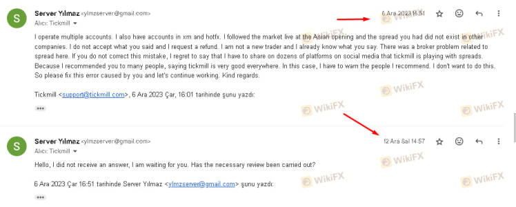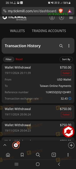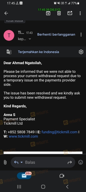起初我很愚蠢,没有在 Wikifx 上看到有关该经纪人的评论。最初我存了63美元。但我无法在以下提供的服务器上进行交易 Tickmill。因为我一直没有时间交易,所以最后我想退出。但是饮料取款必须是80美元,因为我要取款。我存回了63美元。但1x24小时已经过去了。他们根本不回应,我认为这是一个骗局。我希望有请愿书要求采取法律行动。