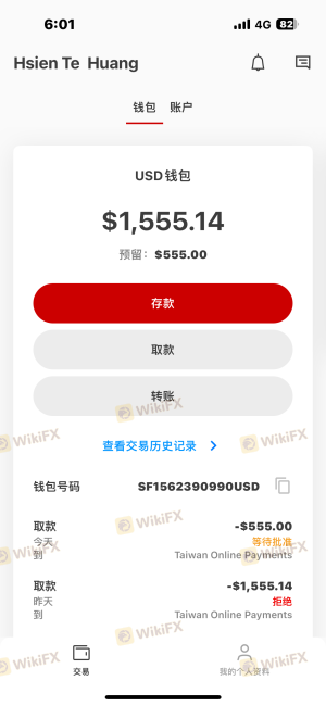 入金四分钟出金三催四请无结果又拒绝入金操作约一周一周后要出金失败原本出金1555汇款555usdt 平台拒绝555ustd并表示要用一样入金发的方式出金结果另外这1555用一样的方式出金也是被拒绝(原本用汇款出金也是汇款) 拒绝理由如图咨询客服后再次重新申请后也是被拒绝出金这次连拒绝理由都没说明客服与email也都不回覆仅仅是2110美金这小小的金额都会遇到诈骗