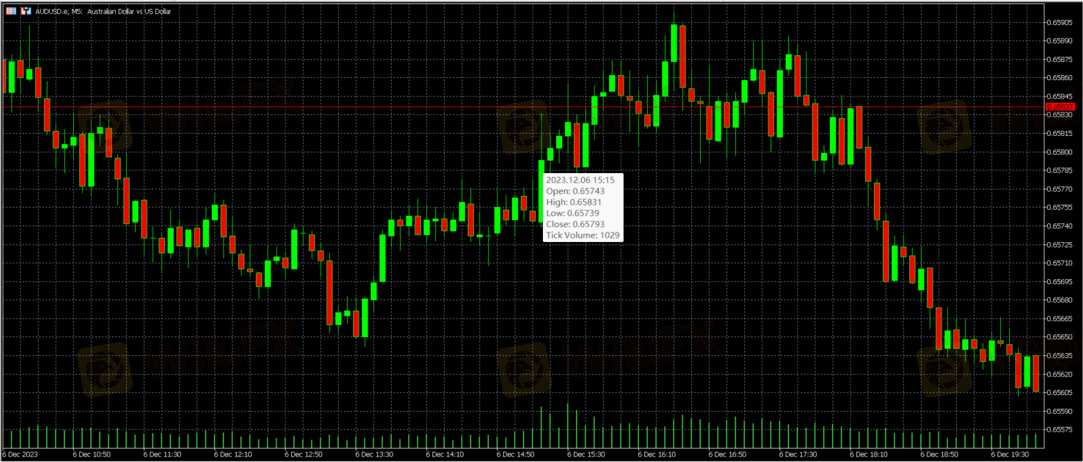 实际公布的美国ADP非农就业数据为103K不及预期的131K,这已经是连续第四个月不及预期。数据公布后(澳洲东部时间12:15am,07.12.2023),AUD/USD上涨,五分钟内从0.65743上涨至0.65793,最高点触及0.65831。