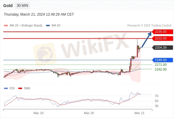 在 2180.00 之上,看涨,目标价位为 2222.00 ,然后为 2235.00 。