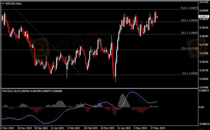 日线图显示纽元兑美元承压下挫,当前仍收于0.5960支撑。从MACD来看,快慢线向上运行,白色动能柱呈平行。汇价走势基本和动能柱的变化一致。