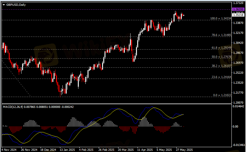 日线图显示英镑兑美元回调下跌,当前仍收于1.3430支撑。从MACD来看,快慢线欲形成死叉,白色动能柱收缩殆尽。汇价走势基本和动能柱的变化一致。