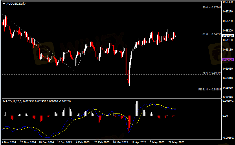 日线图显示澳元兑美元回调下跌,当前测试0.6460支撑。从MACD来看,快慢线形成金叉,红色动能柱温和收缩。汇价走势和动能柱的变化呈分歧。
