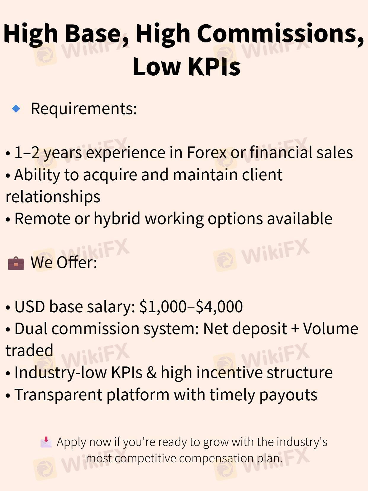 🔹 Requirements: • 1–2 years experience in Forex or financial sales • Ability to acquire and maintain client relationships • Remote or hybrid working options available 💼 We Offer: • USD base salary: $1,000–$4,000 • Dual commission system: Net deposit + Volume traded • Industry-low KPIs & high incentive structure • Transparent platform with timely payouts 📩 Apply now if you're ready to grow with the industry's most competitive compensation plan.