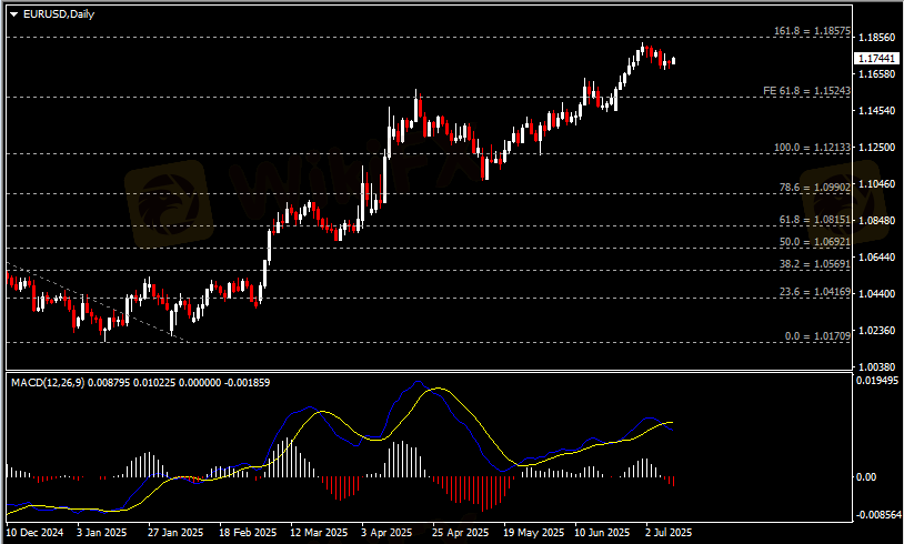 日线图显示欧元兑美元回调暂缓,当前仍承压于1.1860阻力。从MACD来看,快慢线拐向下行,红色动能柱温和增量。汇价走势和动能柱的变化呈分歧。