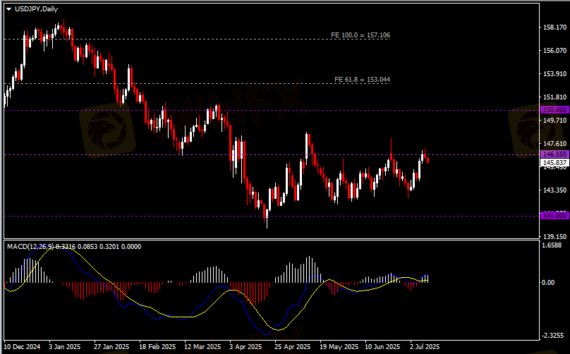 日线图显示美元兑日元遇阻回落,当前承压于146.60阻力。从MACD来看,快慢线向上运行,白色动能柱温和放量。汇价走势和动能柱的变化呈分歧。