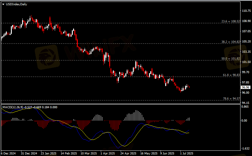 日线图显示美元指数于低位区间震荡,当前承压于98.80阻力。从MACD来看,快慢线向上运行,白色动能柱温和放量。指数走势和动能柱的变化呈分歧。