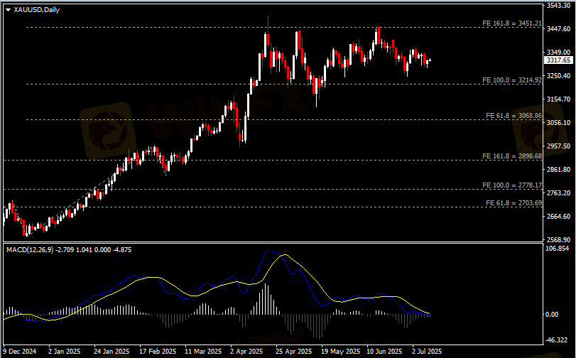 日线图显示金价小幅反弹,当前仍承压于3450阻力。从MACD来看,快慢线向下运行,红色动能柱温和收缩。金价走势基本和动能柱的变化一致。
