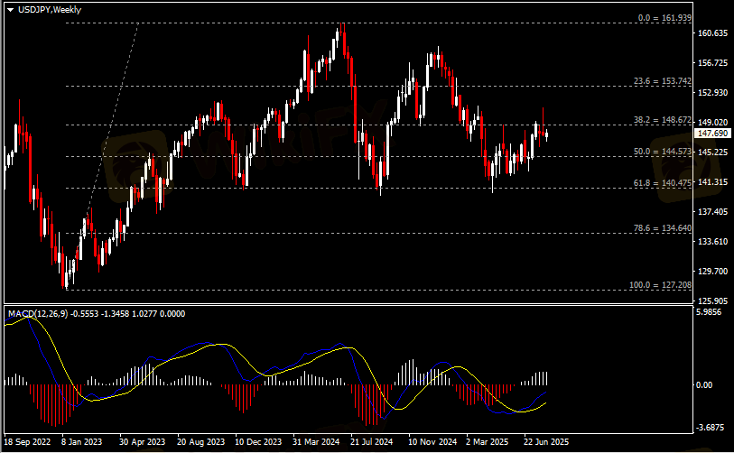 周线图显示美元兑日元恢复上行,当前仍承压于148.70阻力。从MACD来看,快慢线向上运行,白色动能柱则呈平行。汇价走势和动能柱的变化呈分歧。