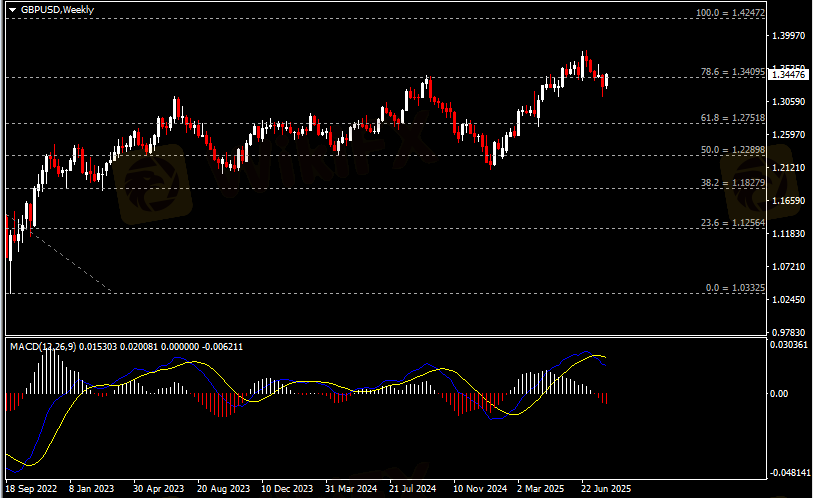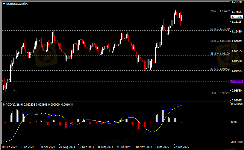 周线图显示欧元兑美元小幅反弹,当前仍承压于1.1750阻力。 从MACD来看,快慢线形成死叉,白色动能柱收缩殆尽。汇价走势和动能柱的变化呈分歧。