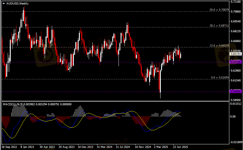 周线图显示澳元兑美元反弹上行,当前仍承压于0.66关键阻力。 从MACD来看,快慢线逐渐收窄,白色动能柱温和收缩。汇价走势和动能柱的变化呈分歧。