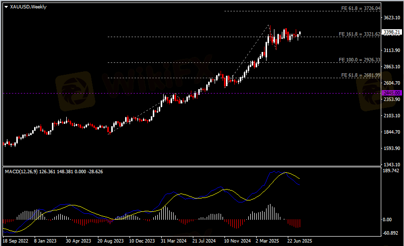 周线图显示金价震荡上行,当前收于3320支撑。从MACD来看,快慢线向下运行,红色动能柱温和收缩。金价走势基本和动能柱的变化一致。