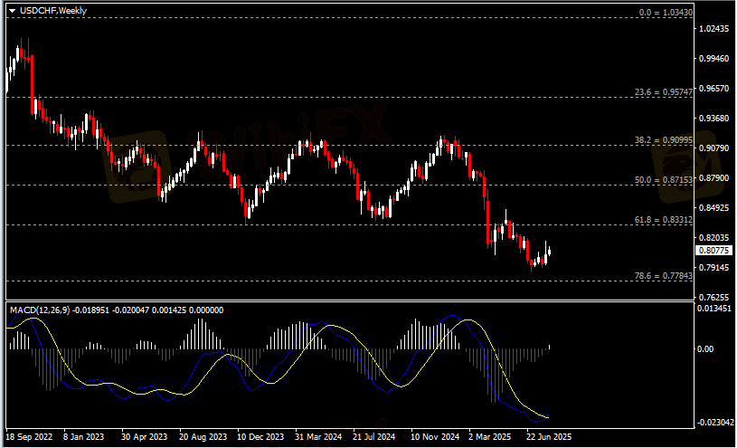 周线图显示美元兑瑞郎反弹上涨,当前收于0.7780支撑。 从MACD来看,快慢线形成金叉,红色动能柱收缩殆尽。汇价走势基本和动能柱的变化一致。