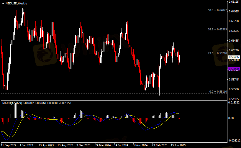 周线图显示纽元兑美元反弹上涨,当前逼近0.5970阻力。从MACD来看,快慢线死叉依旧,红色动能柱温和增量。汇价走势和动能柱的变化呈分歧。