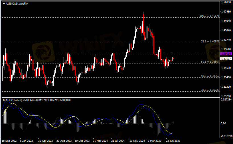 周线图显示美元兑加元小幅下跌,当前承压于1.3860阻力。从MACD来看,快慢线金叉依旧,白色动能柱温和增量。汇价走势和动能柱的变化呈分歧。