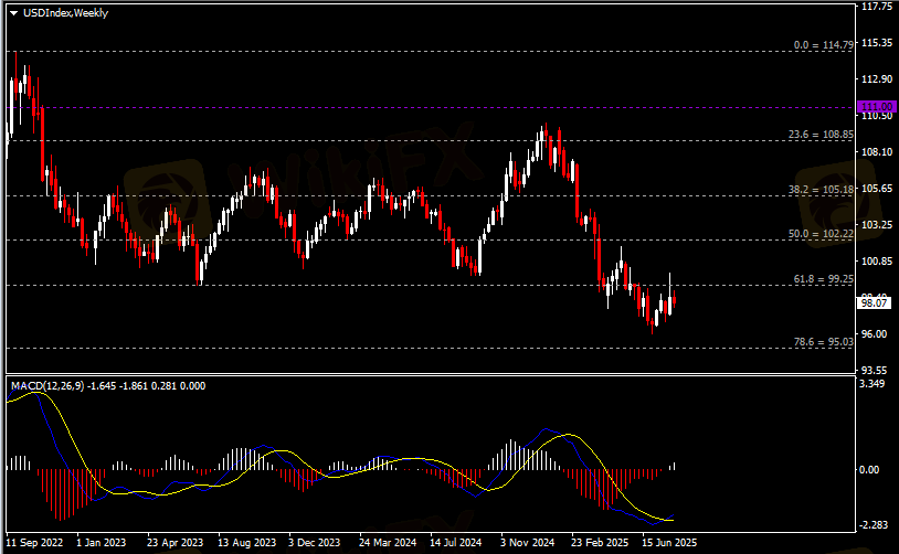 周线图显示美元指数小幅回调,当前承压于99.20阻力。从MACD来看,快慢线金叉依旧,白色动能柱温和增量。指数走势和动能柱的变化呈分歧。