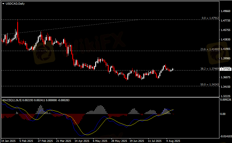 日线图显示美元兑加元反弹收涨于1.3750支撑。从MACD来看,快慢线死叉依旧,红色动能柱温和增量。汇价走势和动能柱的变化呈分歧。