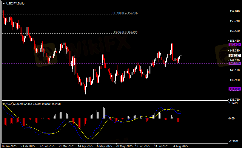 日线图显示美元兑日元震荡走强,当前企稳于146.60支撑。从MACD来看,快慢线呈拐向,红色动能柱温和收缩。汇价走势基本和动能柱的变化一致。