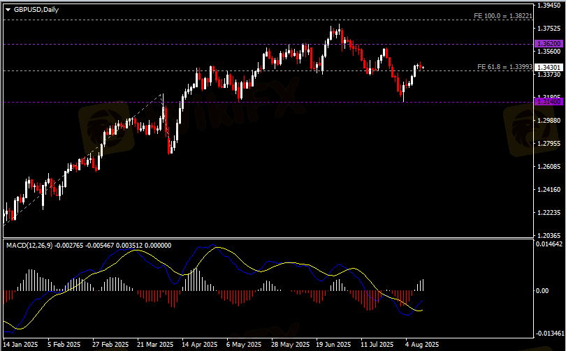 日线图显示英镑兑美元涨势暂缓,当前仍收于1.34关键支撑。从MACD来看,快慢线向上扩张,白色动能柱温和放量。汇价走势和动能柱的变化呈分歧。