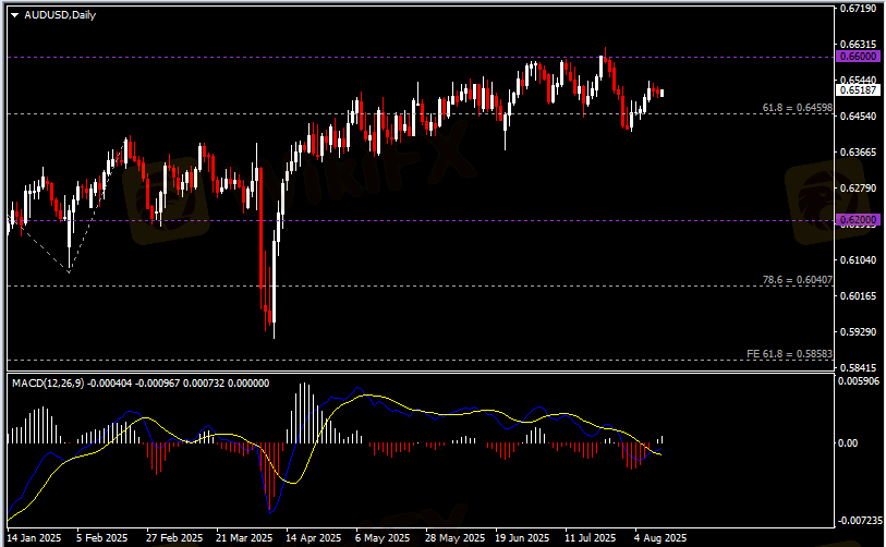 日线图显示澳元兑美元小幅承压,当前仍收于0.6460支撑。从MACD来看,快慢线金叉依旧,白色动能柱温和增量。汇价走势和动能柱的变化呈分歧。
