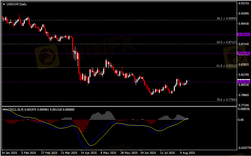 日线图显示美元兑瑞郎震荡上行,当前略收于前高0.81。从MACD来看,快慢线向上运行,白色动能柱略恢复增量。汇价走势基本和动能柱的变化一致。